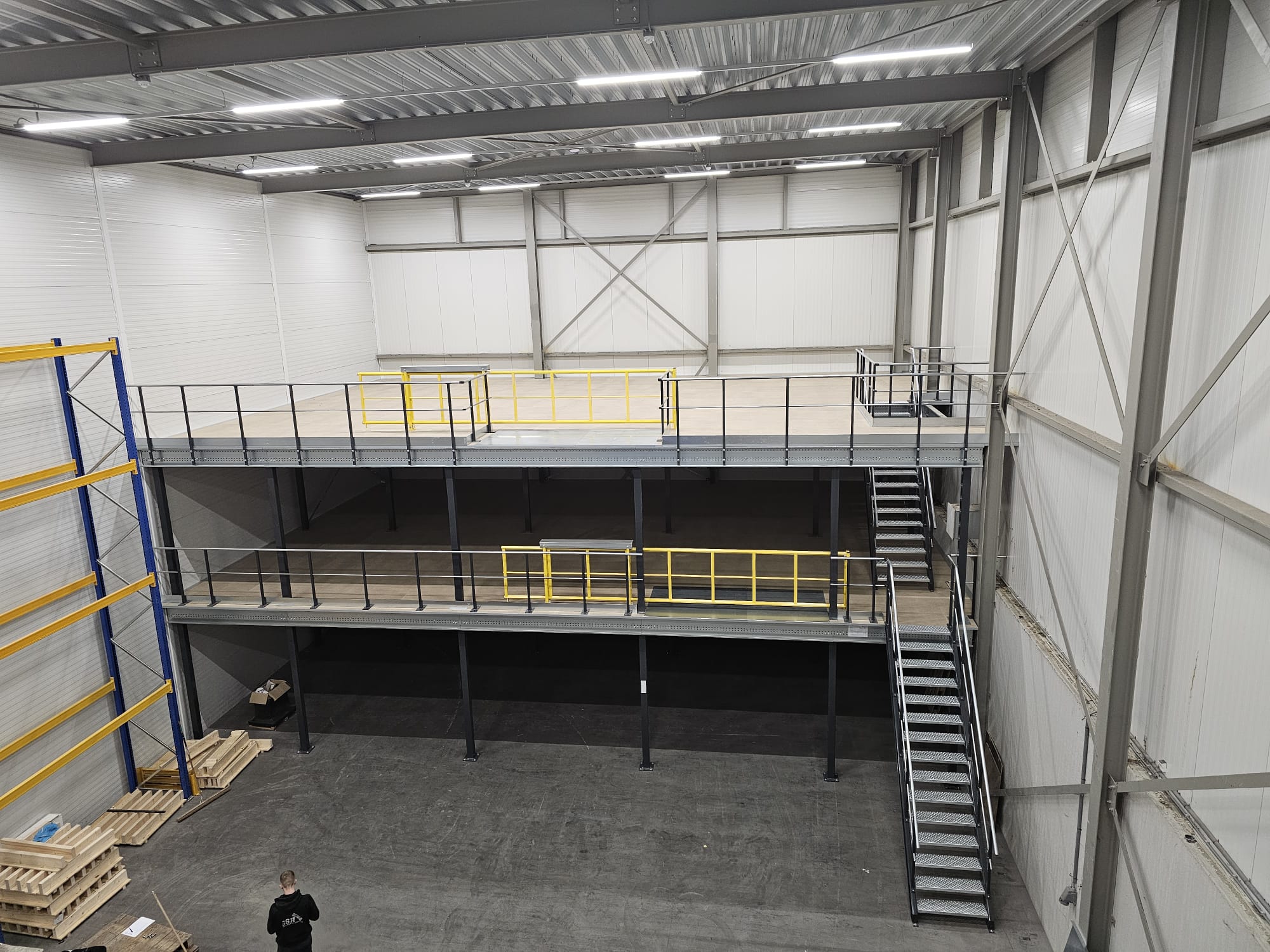 Voor ACS Audiovisual Solutions realiseerde Nolte Mezzanine een entresolvloer met twee verdiepingen en een totaalopperavlakte van 290 m². De vloer is opgebouwd uit koudgewalste profielen, voorzien van een spaanplaat afwerking en geplaatst op een kolomraster van circa 3.300 x 4.700 mm. Dankzij deze efficiënte constructie kon de ruimte optimaal worden benut voor opslag van audiovisuele apparatuur, zonder in te leveren op flexibiliteit op de begane grond.