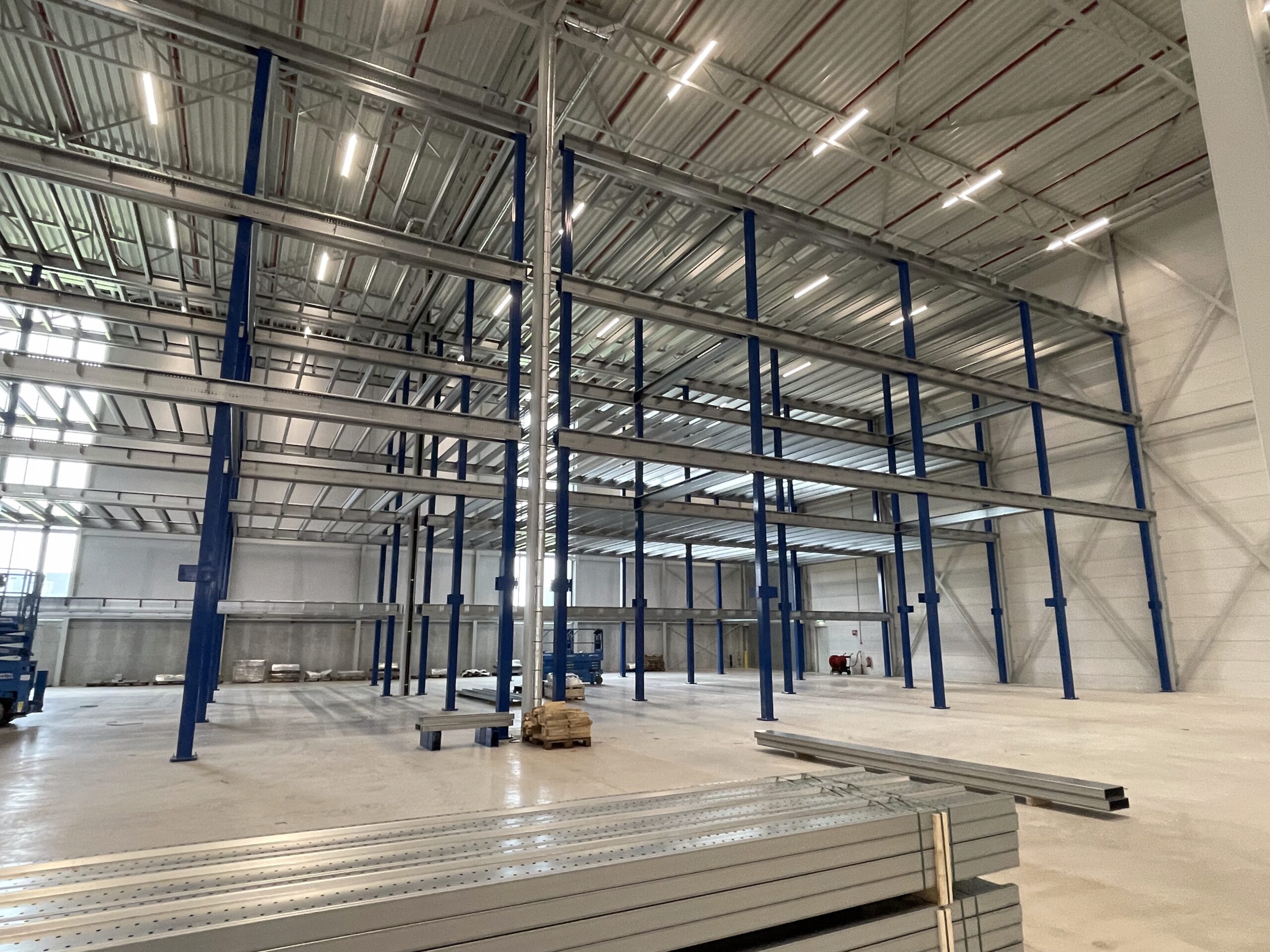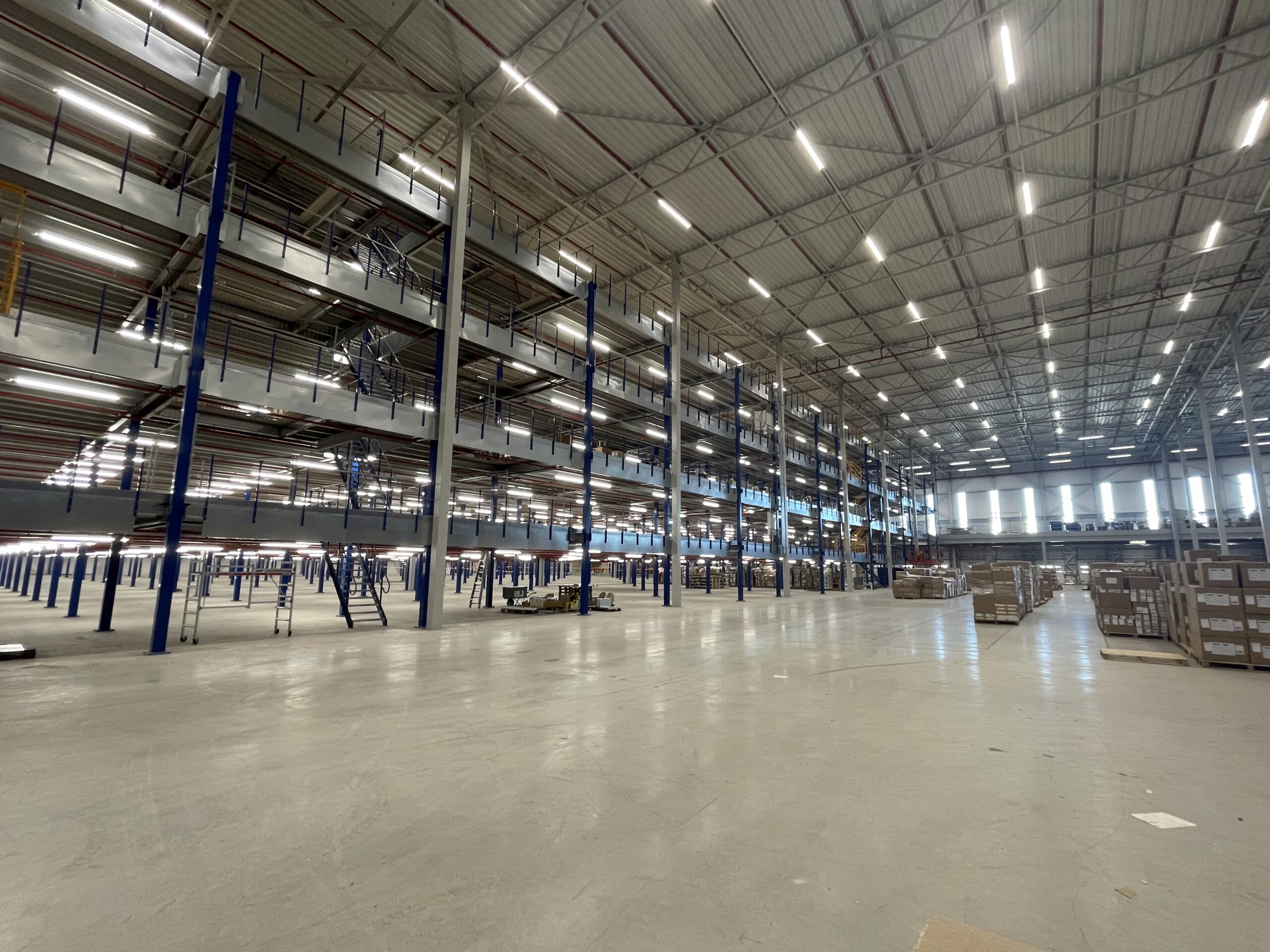 - Transport/montage: het transport en de montage van de mezzaninevloer werden efficiënt uitgevoerd, waarbij 98 vrachtwagens werden ingezet en de installatietijd tot slechts 5 maanden beperkt bleef.