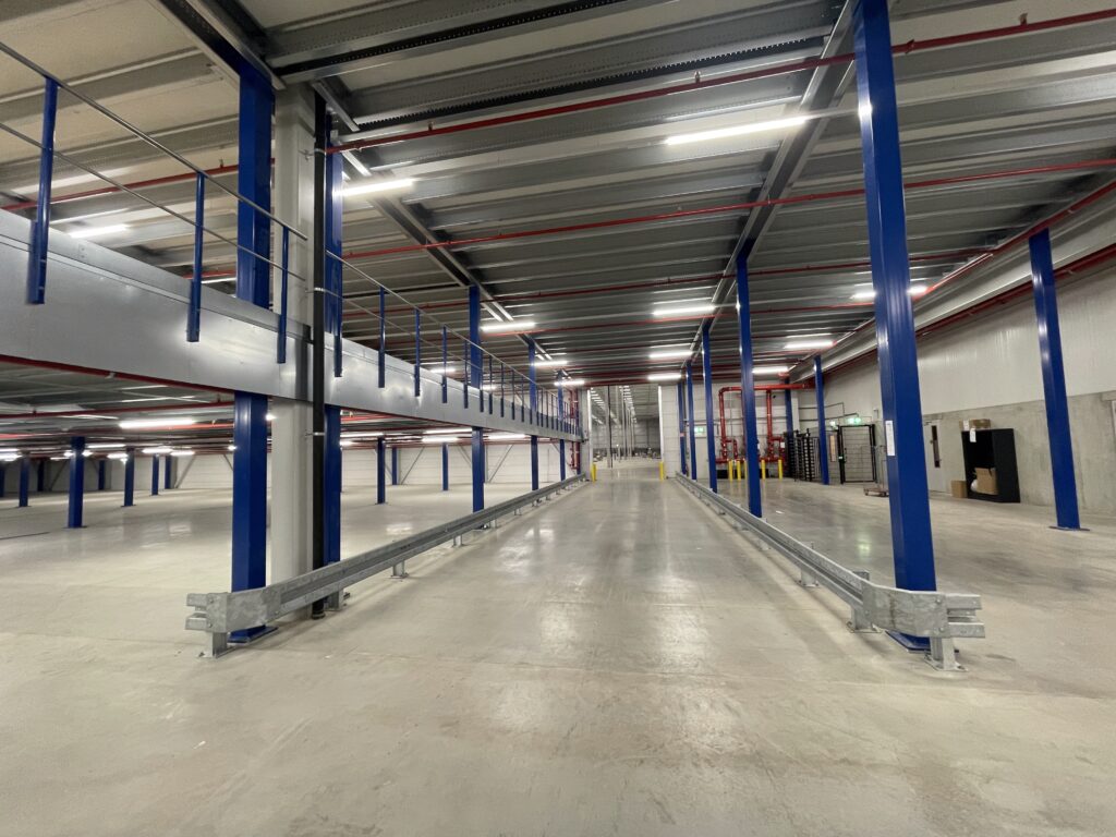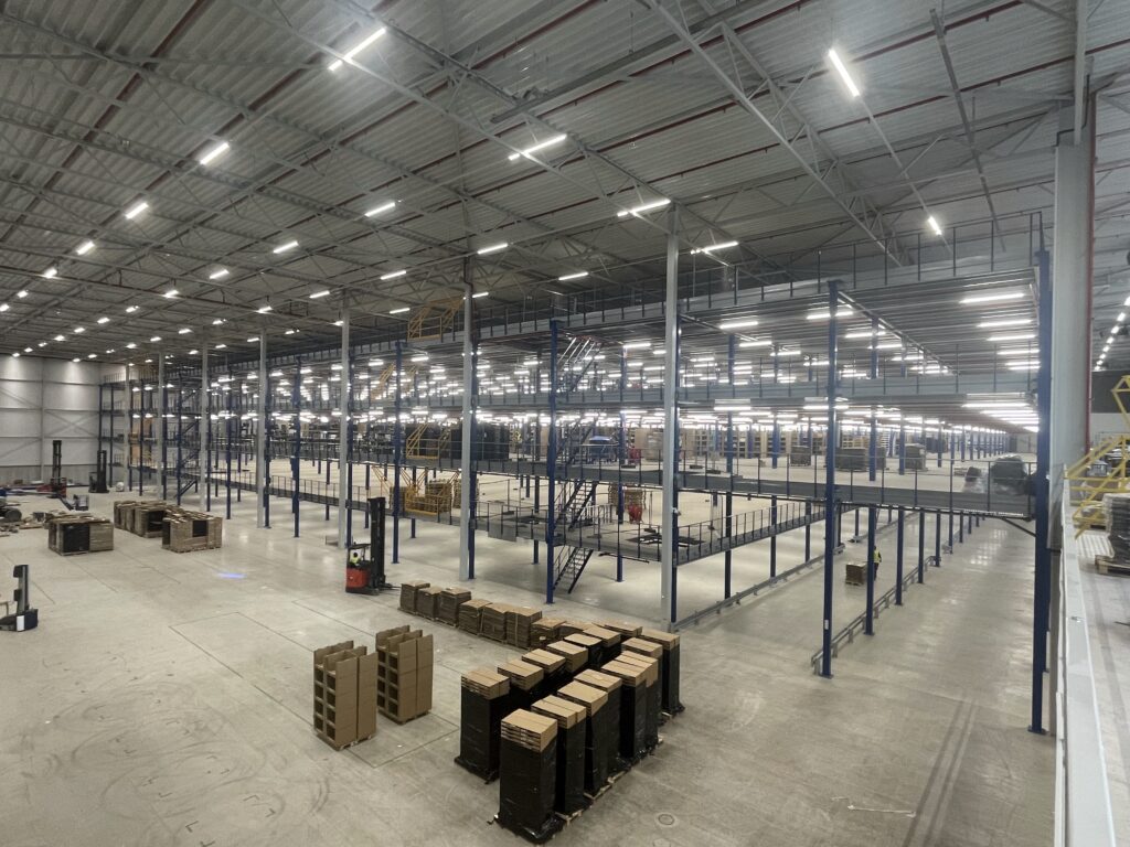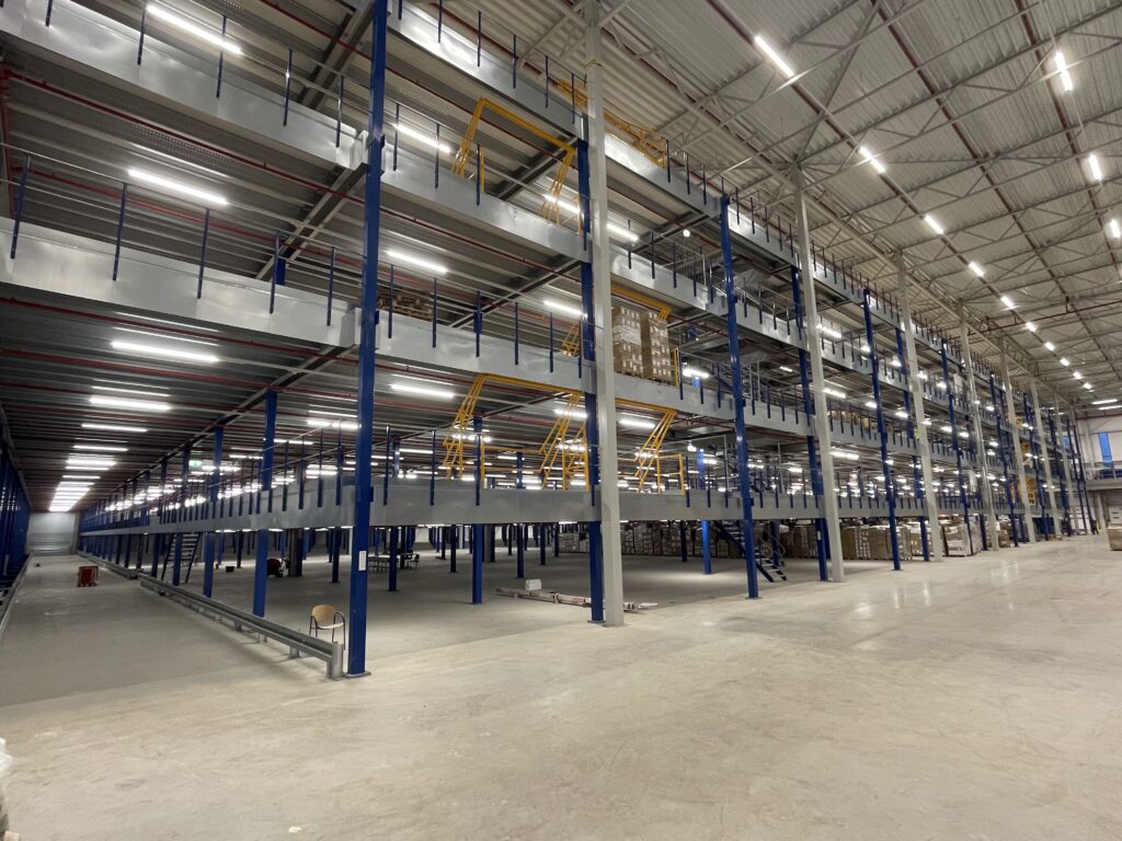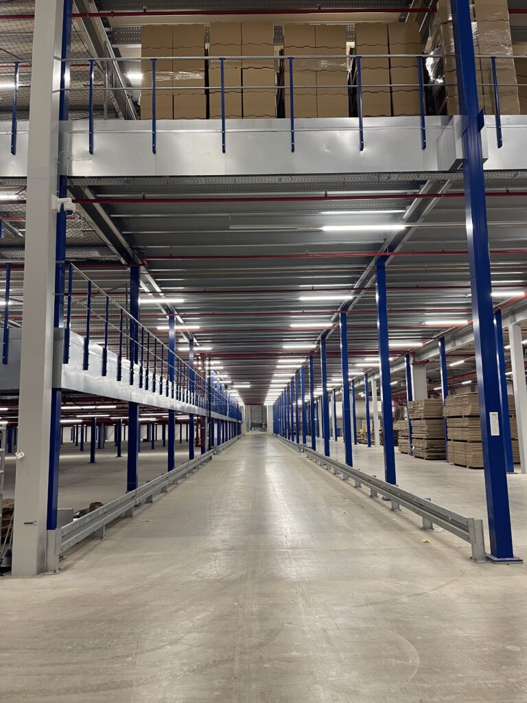 - Transport/montage: het transport en de montage van de mezzaninevloer werden efficiënt uitgevoerd, waarbij 98 vrachtwagens werden ingezet en de installatietijd tot slechts 5 maanden beperkt bleef.