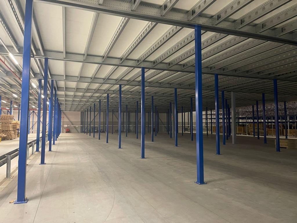 De entresolvloer is opgebouwd uit koudgewalste profielen met een kolomraster van circa 5.000 x 4.500 mm, afgewerkt met een spaanplaat vloer. Met vloerhoogtes van +4.968 mm en +8.000 mm en stabiliteit door portalen is de constructie geschikt voor intensief gebruik als opslag- en pickingtower. Deze oplossing combineert extra capaciteit met een efficiënte en veilige logistieke indeling.