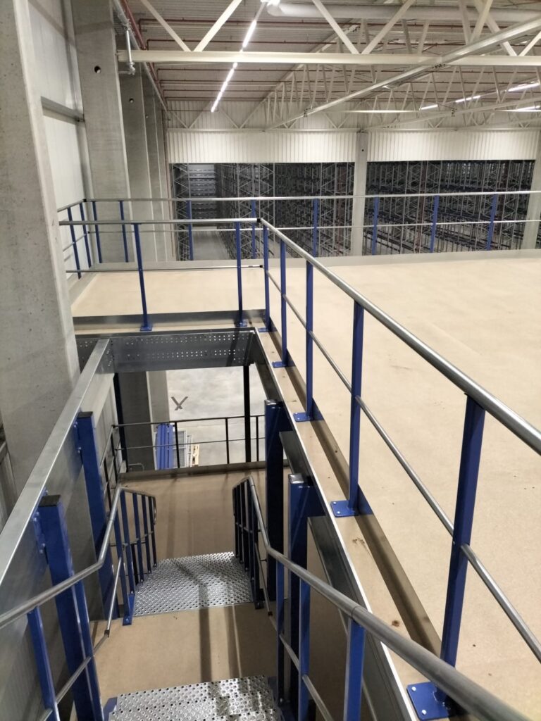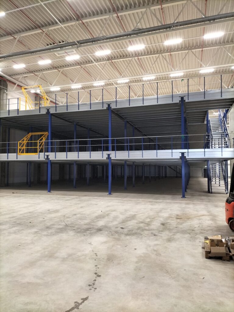 De entresolvloer werd opgebouwd uit koudgewalste profielen met een kolomraster van circa 5.000 x 5.300 mm en voorzien van een spaanplaat vloerafwerking. Met vloerhoogtes van +2.600 mm en +6.796 mm en stabiliteit door portalen en kruisschoren, is de constructie robuust en geschikt voor intensief gebruik. Deze oplossing maakt optimaal gebruik van de beschikbare hoogte en biedt de klant maximale opslagcapaciteit.