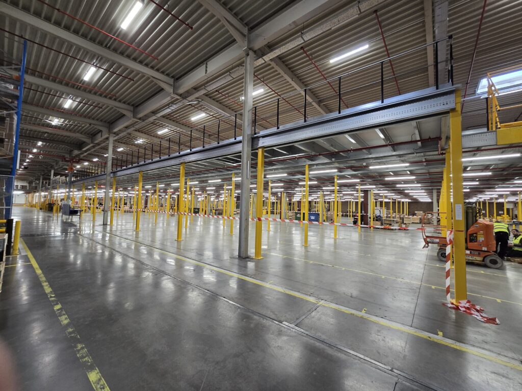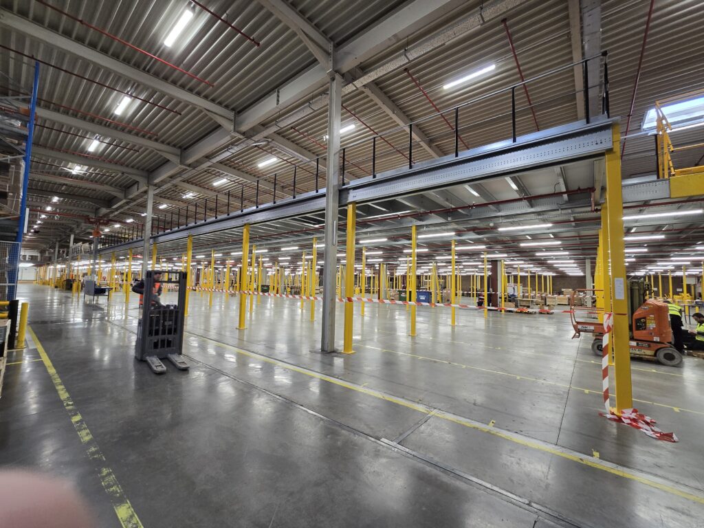 De entresolvloer werd opgebouwd uit koudgewalste profielen met een kolomraster van circa 5.300 x 5.000 mm en voorzien van een spaanplaat vloerafwerking. Met een vloerhoogte van +4.200 mm en stabiliteit door portalen biedt de constructie een stevige basis voor opslag en picking. Deze oplossing maakt het magazijn niet alleen efficiënter, maar ook beter voorbereid op toekomstige uitbreiding.